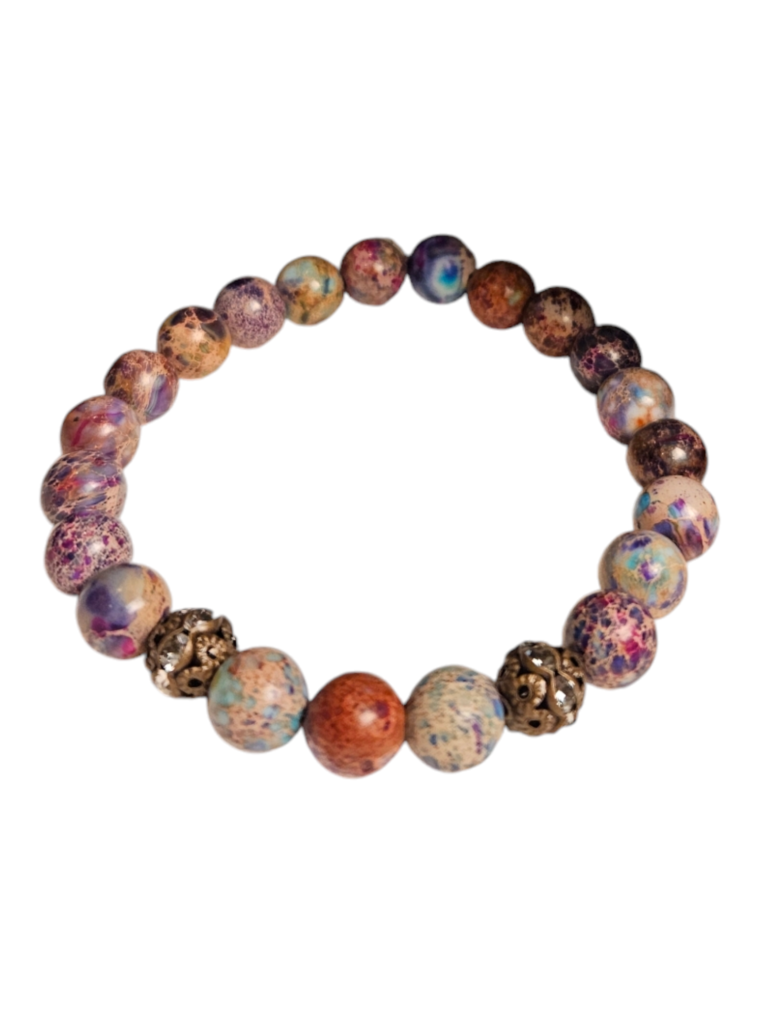 Made with high-quality natural stones. Soft color Sea Sediment with Antique Bronze spacers.