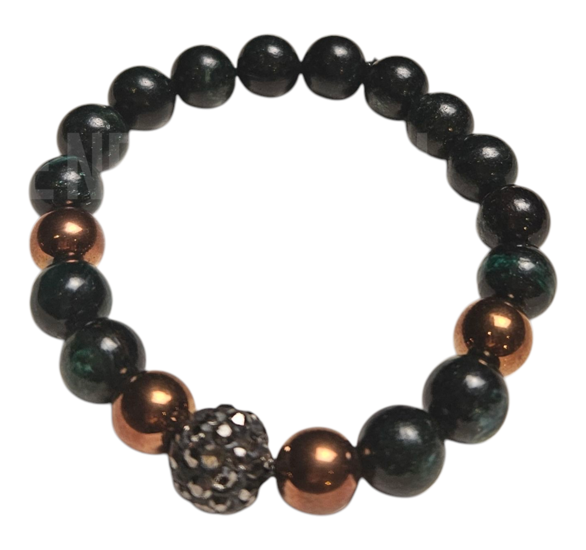 Made with high-quality natural stones - Dark Green Tourmaline beautifully blended with Chocolate Brown Hematite, champagne rhinestones.